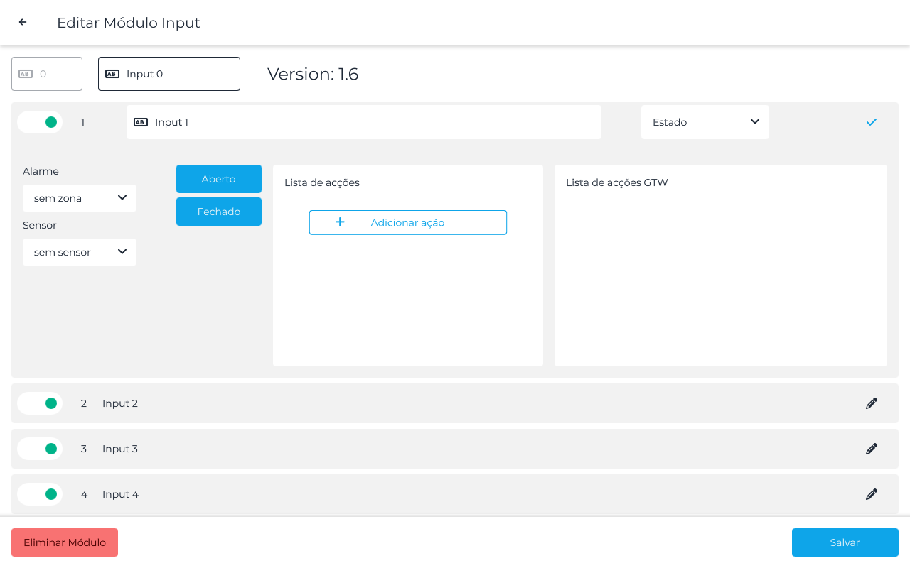 Para associar um input a um output, basta clicar no input desejado , escolher o tipo de pulso ou estado e de seguida clicar em "Adicionar acção". Daqui pode escolher um ou mais dispositivo clicando no "+" à direita.