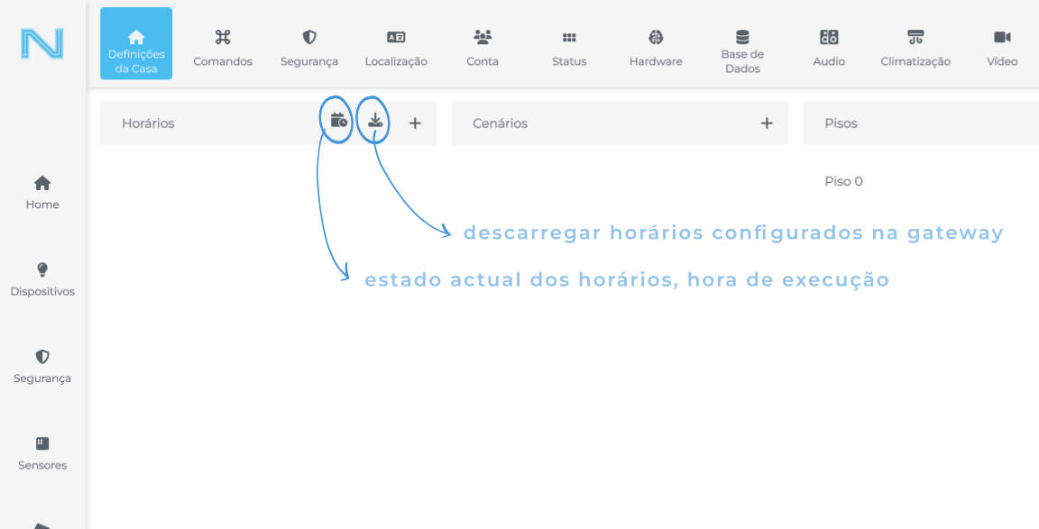 A configuração de horários permite definir quando os dispositivos devem ser ligados ou desligados. Também é possível editar os horários na aplicação móvel, consulte a documentação da aplicação móvel para mais informações.